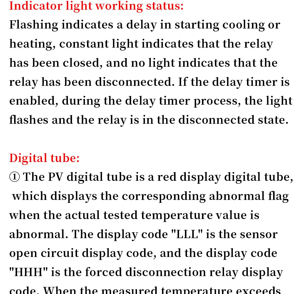 Digital tube: Display LL is the sensor open circuit,please follow the instructions to connect the sensor; display HH is out of the measurement range,the thermostat will forcibly open the relay; display --- for high temperature alarm
