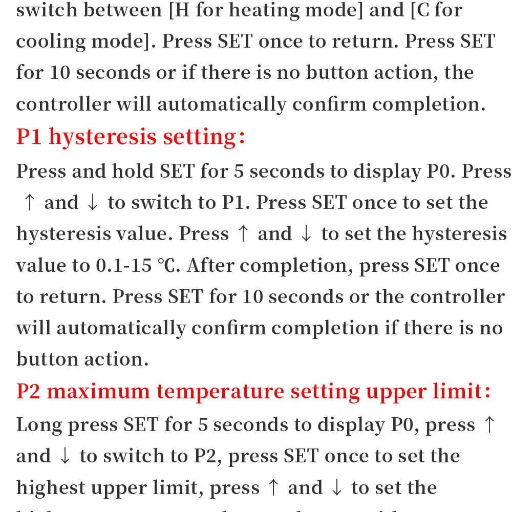 Press and hold SET for 5 seconds to display P0,press +- to switch to P2,press SET once to set the upper limit,press +- to set the highest settable temperature,the maximum value is 110,press SET once after completion,press SET or 10 The second button is not pressed and the controller automatically confirms the completion.