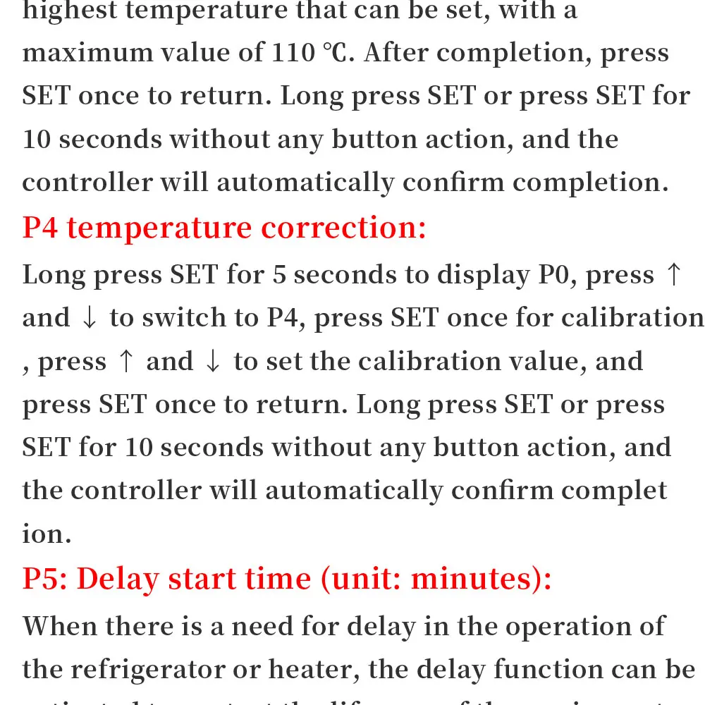 Press and hold SET for 5 seconds to display P0,press +- to switch to P5,press SET once to set the delay start time unit is minute,press +- to set 0-10 minutes,press SET to return after completion,long press SET or 10 seconds No button action controller automatically confirms completion