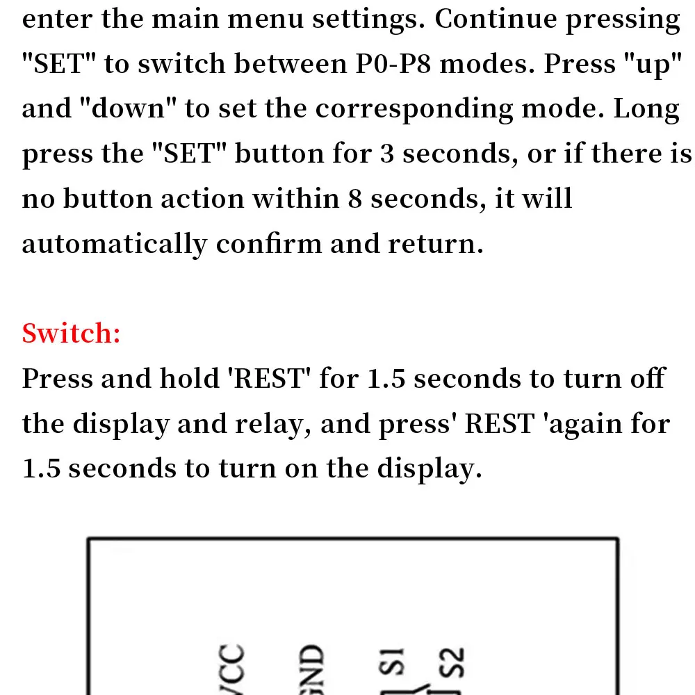 Press and hold SET for 5 seconds to enter the main menu settings,press +- to switch P0...P6,long press SET or 10 seconds without button action,the controller automatically confirms the return.