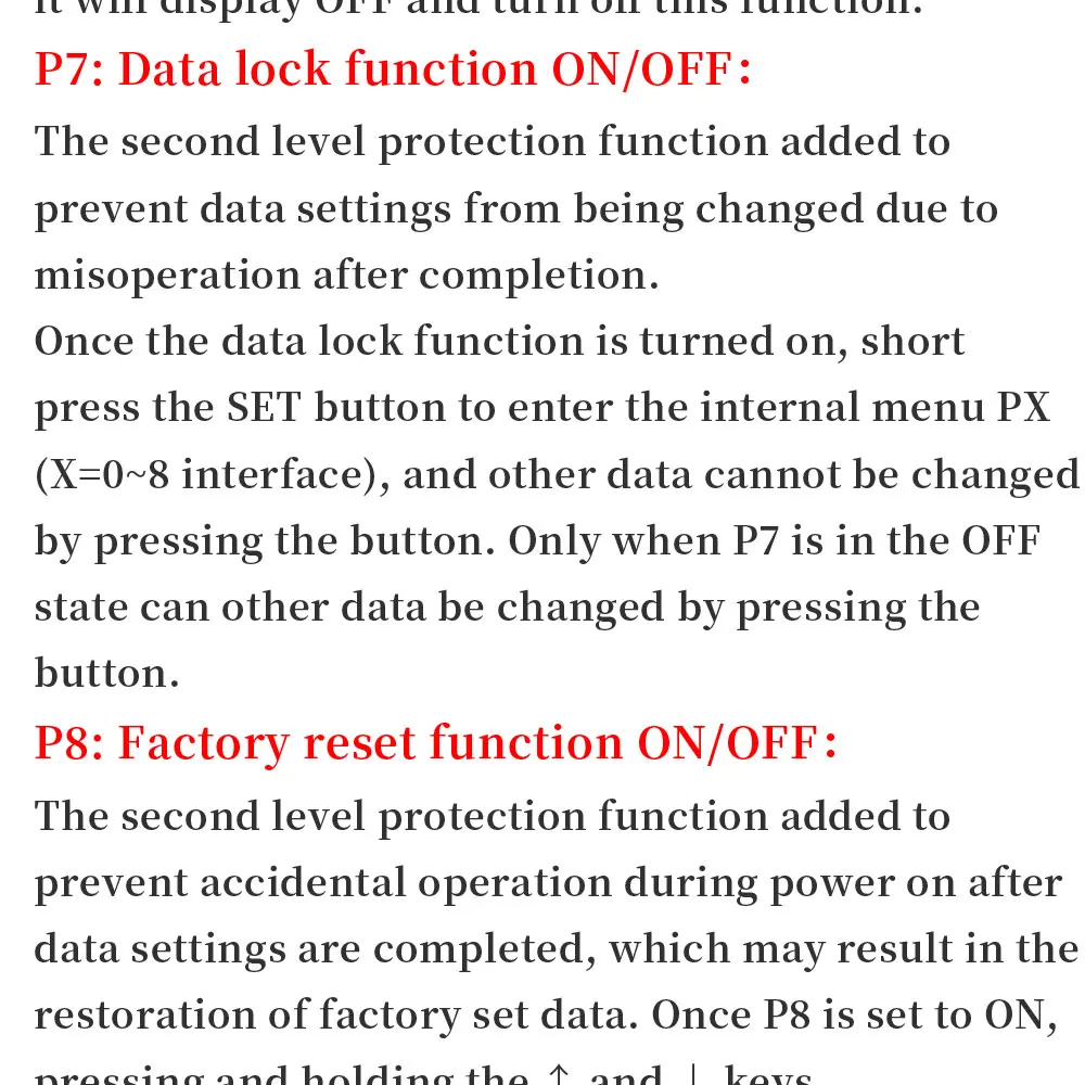 P7- נעילת נתונים: בכדי למנוע מאנשים אחרים לשנות את הטמפרטורה שהגדרנו , לאחר הכנסת הנתונים P7 יהיה במצב ON, ולא יהיה ניתן לשנות את הטמפרטורה והפרמטרים הפנימיים.