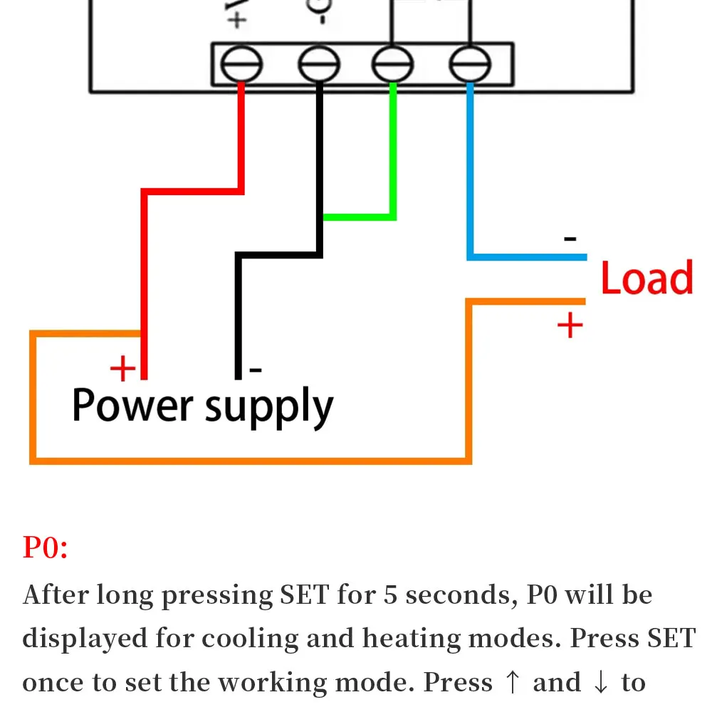 Press and hold SET for 5 seconds to display P0,press SET once to set the working mode,press +- to switch [H is heating mode] [C is cooling mode] Press SET once to return,long press SET or 10 seconds without button action controller automatically confirm carry out.
