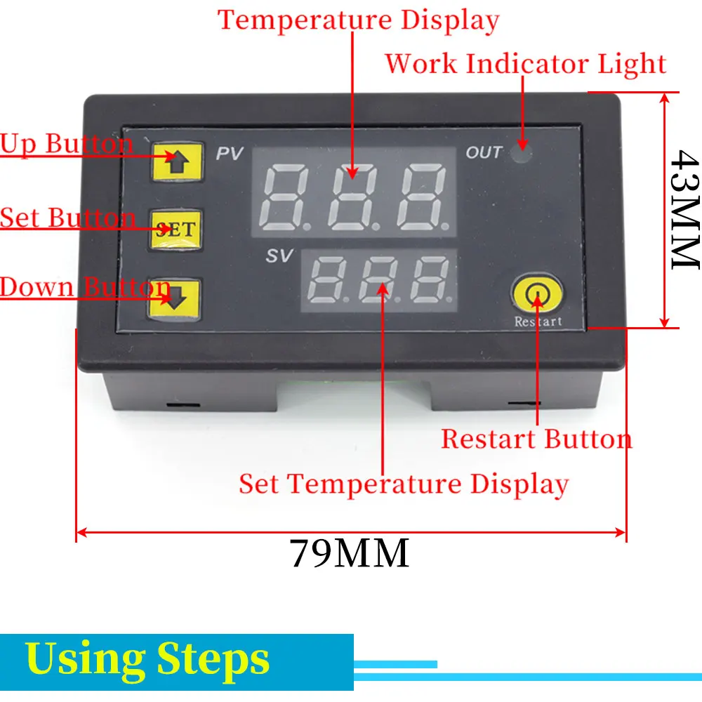 לאחר חיבור הבקר לחשמל, הטמפרטורה בפועל מוצגת בצבע אדום, לחיצה על לחצן SET התצוגה הכחולה תהבהב, לחץ על לחצן DOWN או UP בכדי לכוון את טמפרטורת ההפעלה.