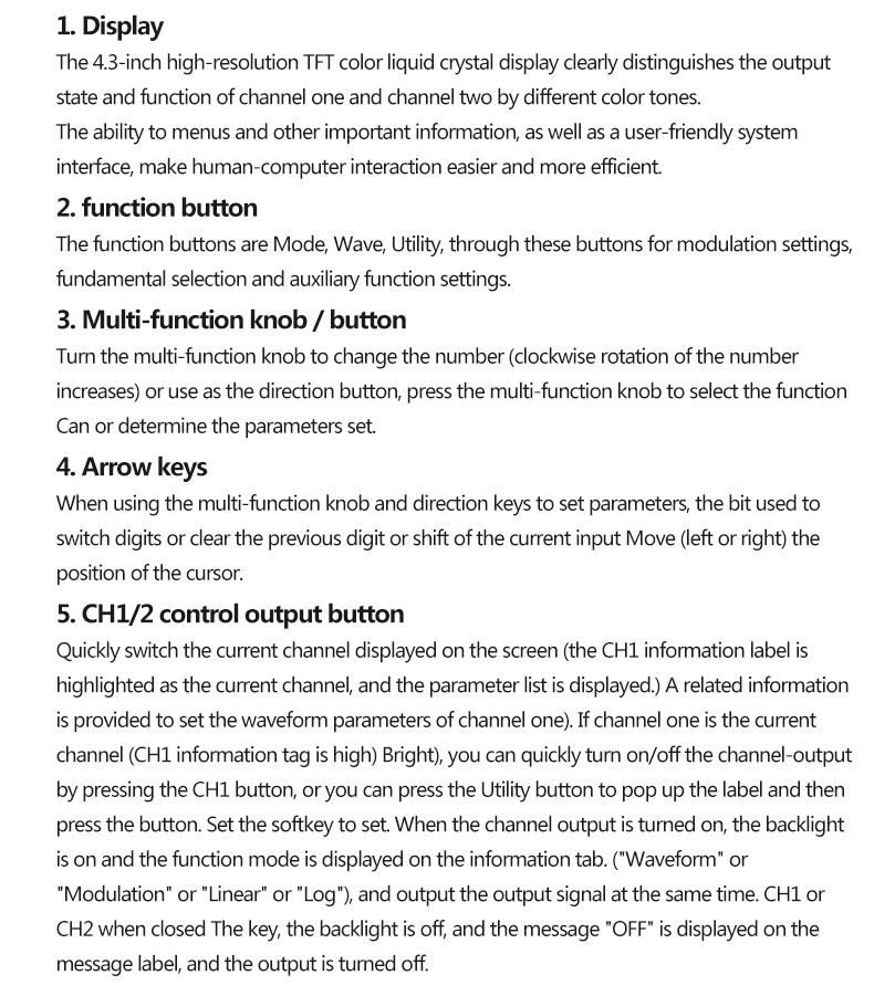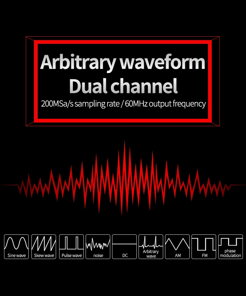 ● Output waveforms: Sine, square, pulse, ramp, noise, DC, arbitrary ● Output frequency range: 1μHz-30MHz/60MHz ● High-accuracy, broad-band 6 bit frequency counter, range: 100mHz~100MHz ● Two equivalent-performance channels ● 4.3 inches TFT LCD